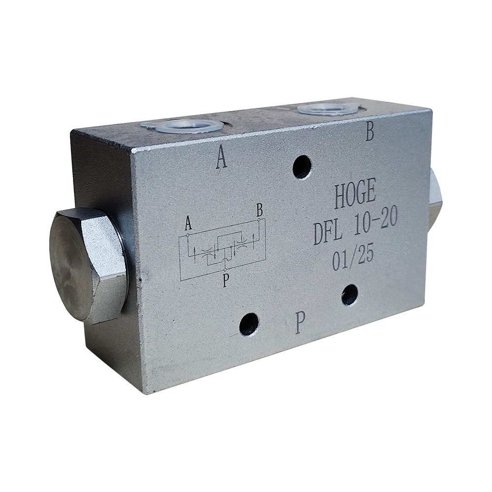 Основная функция клапана делителя потока – деление одного входящего потока из порта Р на два одинаковых по величине потока А и В вне зависимости от разности давлений на этих линиях А и В, тем самым движение двух независимых друг от друга гидроцилиндров выполняется с одинаковой скоростью, вне зависимости от разницы нагрузок на гидроцилиндры. Также этот клапан может выполнять функцию сумматора потока при движении потока рабочей жидкости из портов А и В в Р линию.