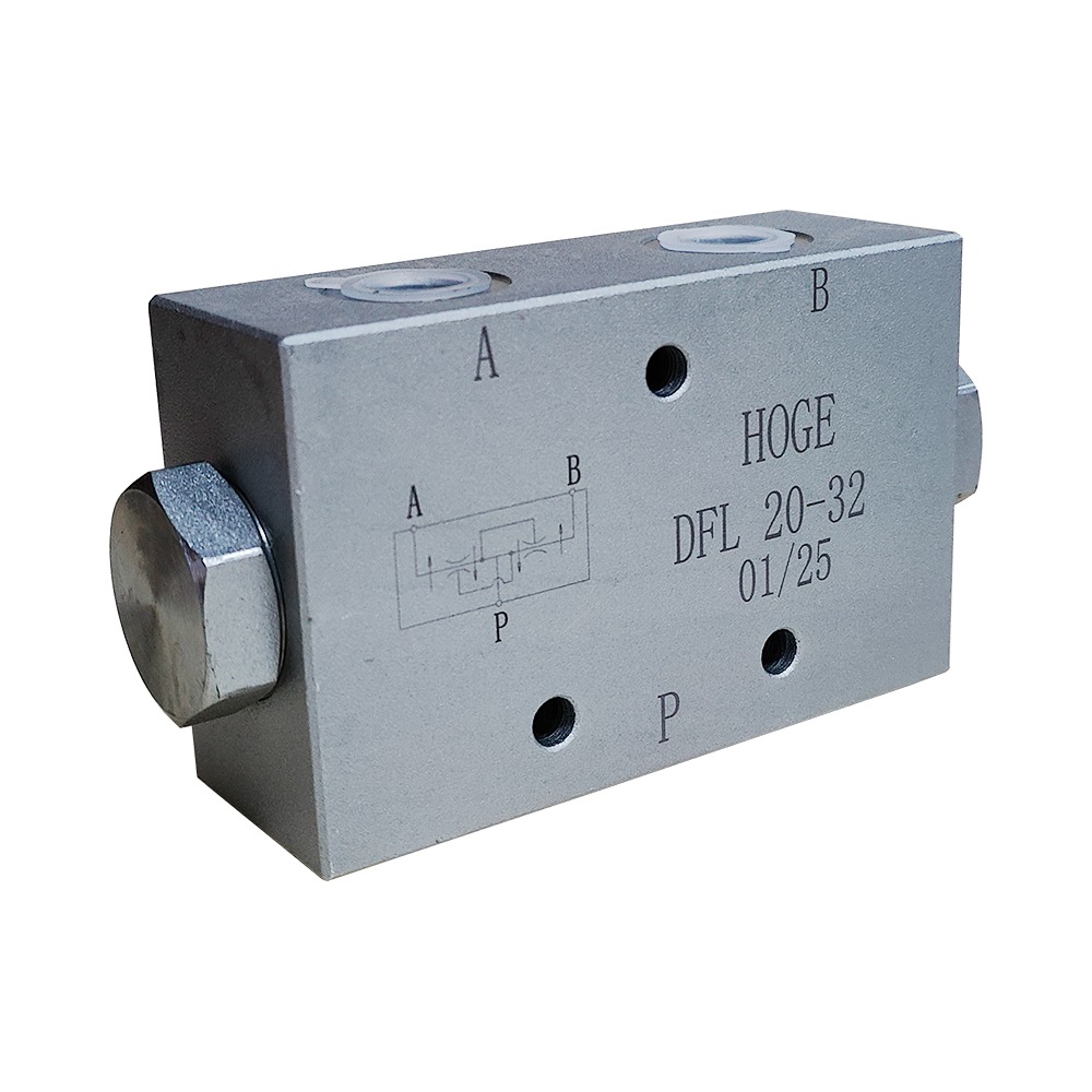Основная функция клапана делителя потока – деление одного входящего потока из порта Р на два одинаковых по величине потока А и В вне зависимости от разности давлений на этих линиях А и В, тем самым движение двух независимых друг от друга гидроцилиндров выполняется с одинаковой скоростью, вне зависимости от разницы нагрузок на гидроцилиндры. Также этот клапан может выполнять функцию сумматора потока при движении потока рабочей жидкости из портов А и В в Р линию.