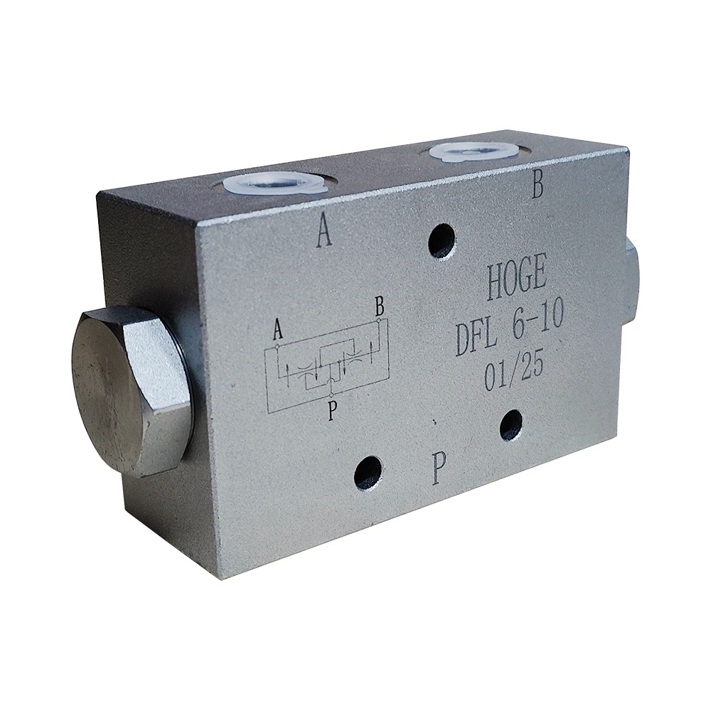 Основная функция клапана делителя потока – деление одного входящего потока из порта Р на два одинаковых по величине потока А и В вне зависимости от разности давлений на этих линиях А и В, тем самым движение двух независимых друг от друга гидроцилиндров выполняется с одинаковой скоростью, вне зависимости от разницы нагрузок на гидроцилиндры. Также этот клапан может выполнять функцию сумматора потока при движении потока рабочей жидкости из портов А и В в Р линию.