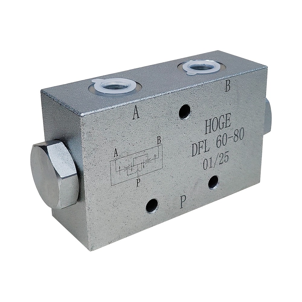 Основная функция клапана делителя потока – деление одного входящего потока из порта Р на два одинаковых по величине потока А и В вне зависимости от разности давлений на этих линиях А и В, тем самым движение двух независимых друг от друга гидроцилиндров выполняется с одинаковой скоростью, вне зависимости от разницы нагрузок на гидроцилиндры. Также этот клапан может выполнять функцию сумматора потока при движении потока рабочей жидкости из портов А и В в Р линию.