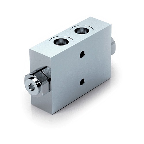 Стандартный двухсторонний гидрозамок с отверстиями для подключения по двум параллельным плоскостям корпуса. При отсутствии управляемого потока на гидроцилиндр – гидрозамок удерживает гидроцидиндр в двух направлениях линейного движения: «подъём» и «опускание». При подаче управляемого сигнала на гидроцилиндр – гидрозамок открывает полости основных каналов и поток свободно попадает в нужную полость цилиндра и тот, начинает линейное движение.