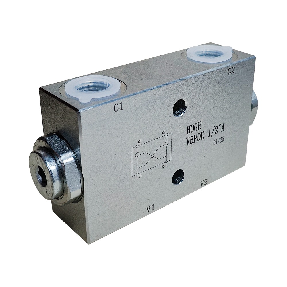 Стандартный двухсторонний гидрозамок тип А с отверстиями для подключения по двум параллельным плоскостям корпуса. При отсутствии управляемого потока на гидроцилиндр – гидрозамок удерживает гидроцидиндр в двух направлениях линейного движения: «подъём» и «опускание». При подаче управляемого сигнала на гидроцилиндр – гидрозамок открывает полости основных каналов и поток свободно попадает в нужную полость цилиндра и тот начинает линейное движение.