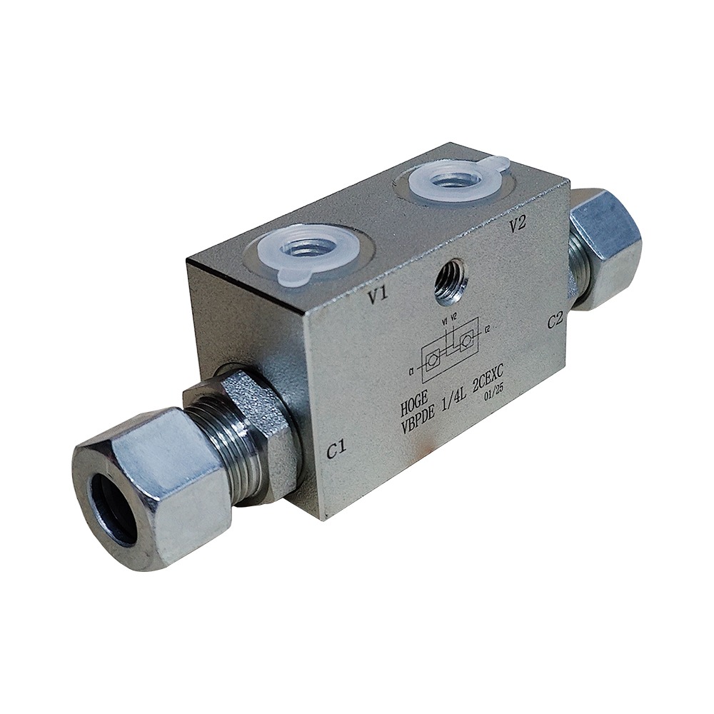Гидрозамок VBPDE 2 CEXC двухстороннего действия используется для блокировки цилиндра в обоих направлениях, позволяя потоку гидравлической жидкости течь в одном направлении и предотвращая её поток в противоположном направлении, пока не будет приложено управляющее воздействие. По запросу могут быть поставлены специальные монтажные комплекты для монтажа с определенным межосевым расстоянием.