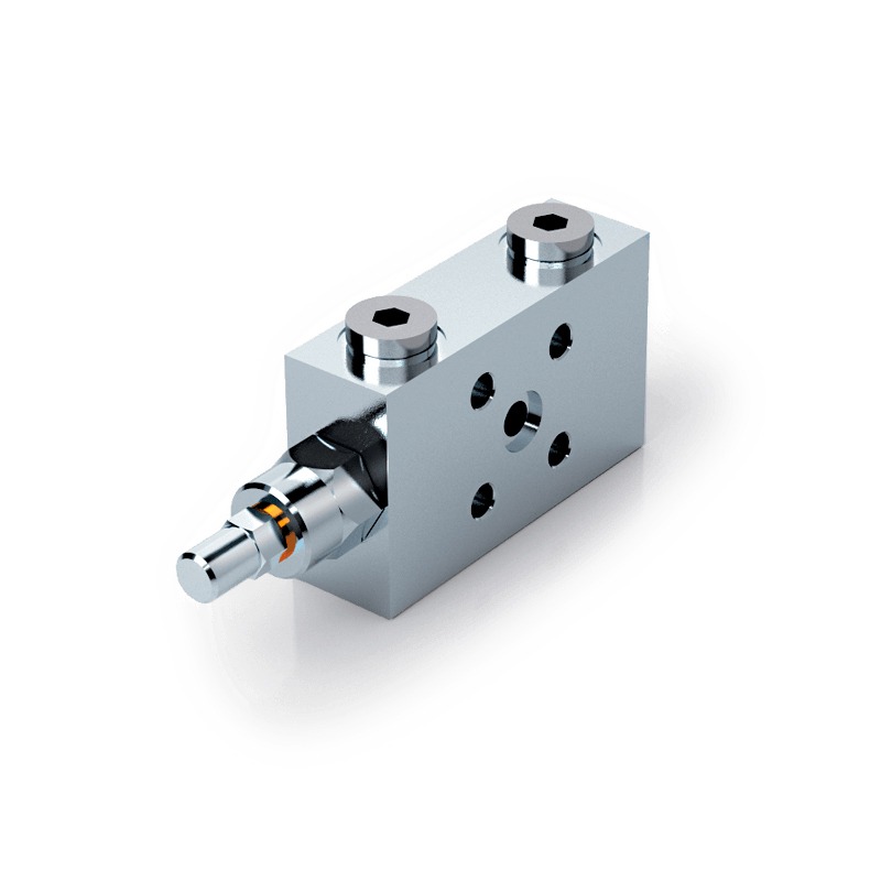 Односторонний тормозной клапан. Клапан используется для управления движением и блокировки привода только в одном направлении, реализуя контролируемый спуск нагрузки. Главная функциональная особенность – это обеспечение плавного подъёма/опускания гидроцилиндра, без рывков (при наличии попутной нагрузки). Давление настройки регулируется вращением шестигранного ключа: вращение регулировочного винта против часовой стрелки (раскручивание) – снижение настроечного давления, вращение регулировочного винта по часовой стрелке (закручивание) – повышение значения установленного давления. Фланцевые соединения позволяют напрямую устанавливать клапан на привод.