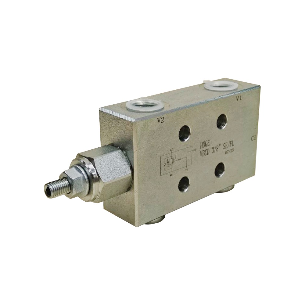Односторонний тормозной клапан. Клапан используется для управления движением и блокировки привода только в одном направлении, реализуя контролируемый спуск нагрузки. Главная функциональная особенность – это обеспечение плавного подъёма/опускания гидроцилиндра, без рывков (при наличии попутной нагрузки). Давление настройки регулируется вращением шестигранного ключа: вращение регулировочного винта против часовой стрелки (раскручивание) – снижение настроечного давления, вращение регулировочного винта по часовой стрелке (закручивание) – повышение значения установленного давления. Фланцевые соединения позволяют напрямую устанавливать клапан на привод.